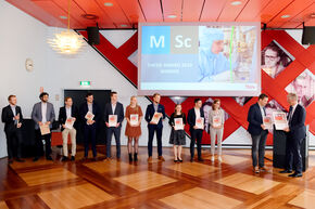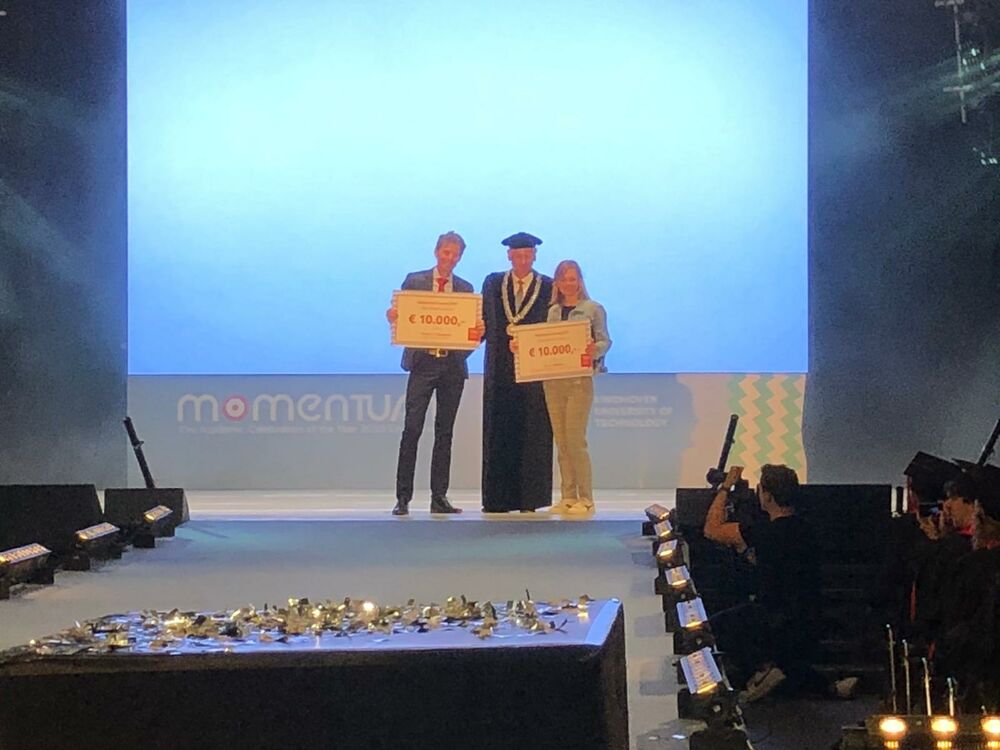 16.45 uur | Ze passeerden al eerder in dit liveblog de revue, maar ook tijdens de MomenTUm-ceremonie in de markthal worden diverse 'prijswinnaars' van vandaag nog even in het zonnetje gezet. Op de foto de winnaars van de Academic Awards en Marina van Damme-prijs, met rector Frank Baaijens in hun midden.