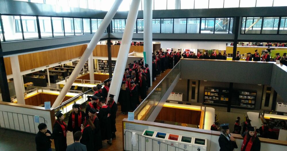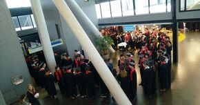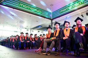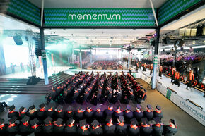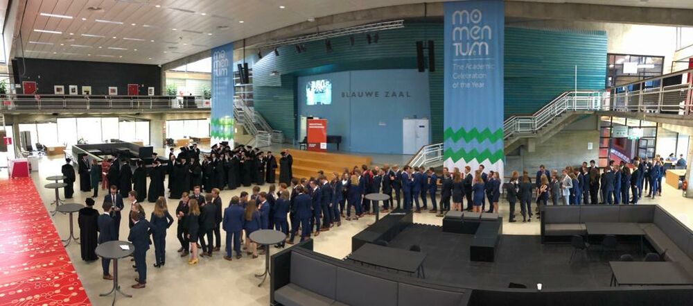 17.39 uur | De MomenTUm Ceremony zit erop. De markthal wordt nu leeggeruimd voor de Student Party van vanavond, met optredens van onder andere The Night Flight en The Partysquad. In de hal van Atlas is intussen de MomenTUm-receptie begonnen voor afstudeerders, hun gasten en andere genodigden en bezoekers. Cheers allemaal!