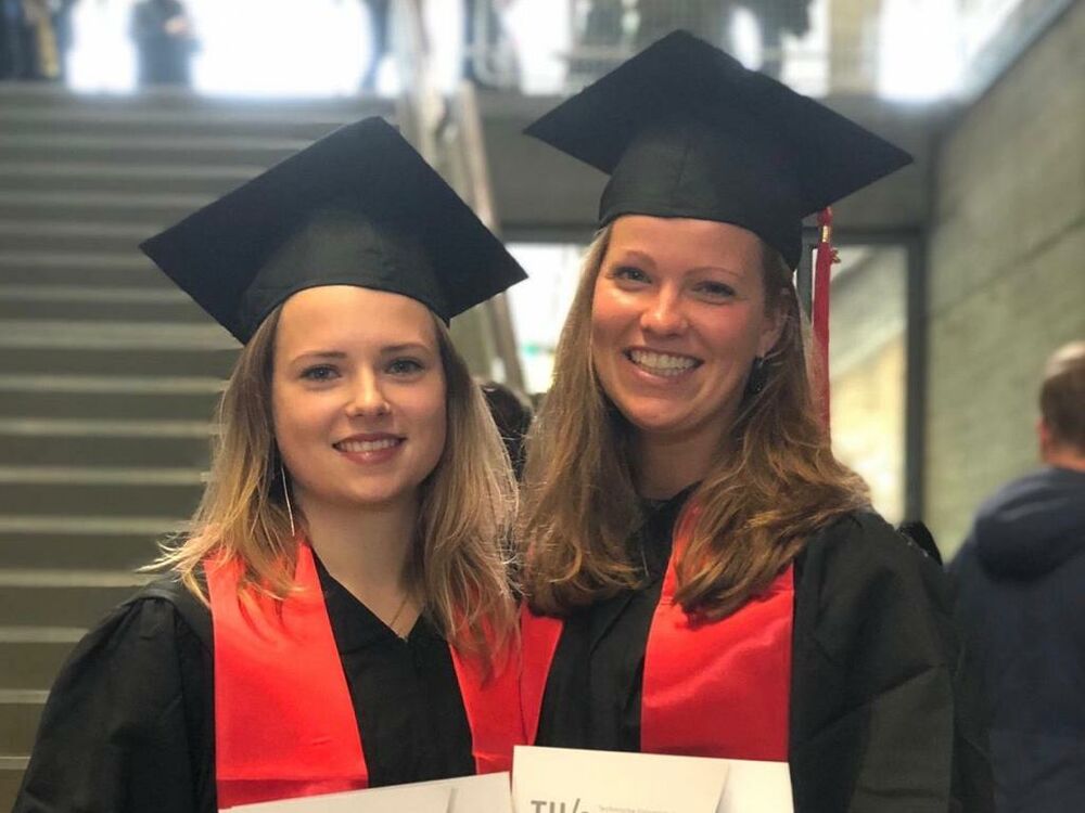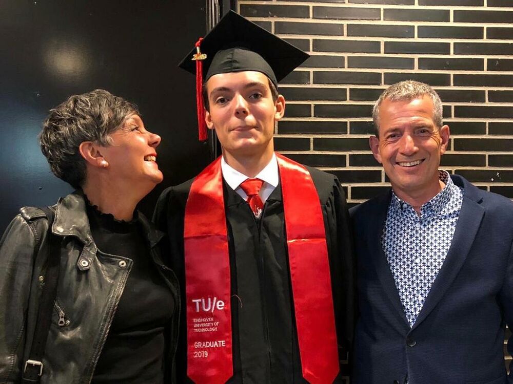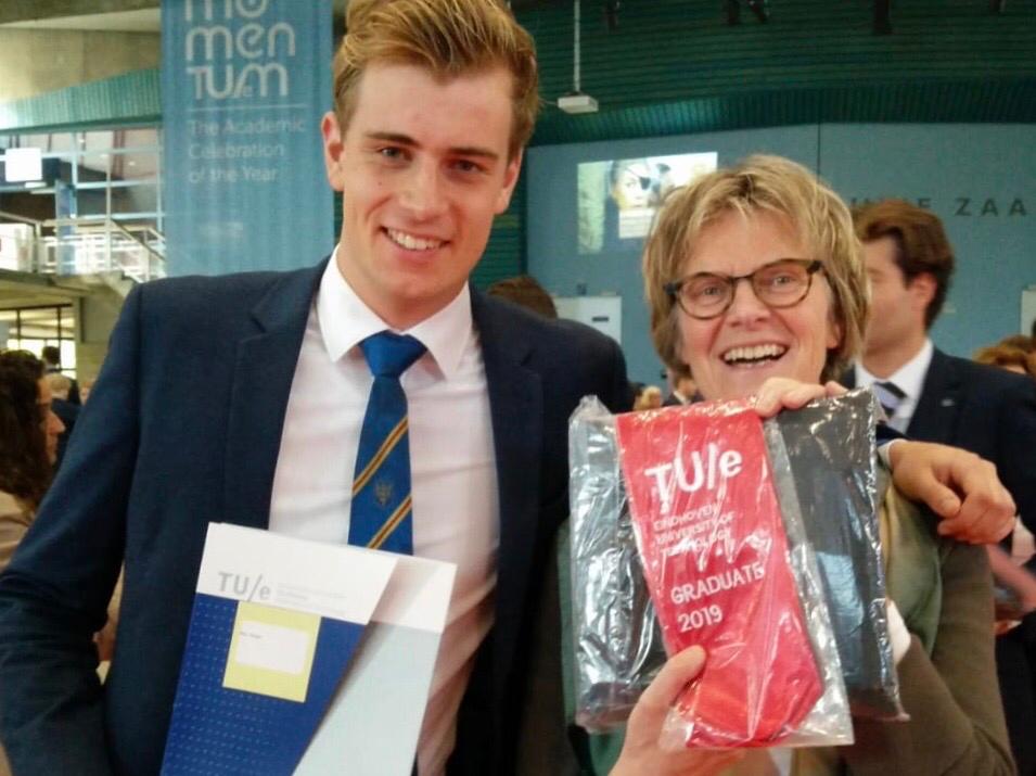 En nog meer trotse gezichten hieronder. Waaronder die van Iris Cornelissen (links) en Lisan Warffemius van Bouwkunde op de foto linksboven. En die van Bas Buijse (Technische Bedrijfskunde) én zijn moeder rechtsboven.