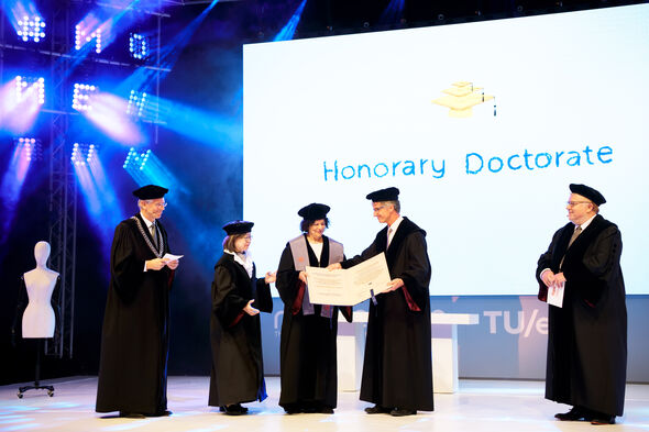 11.27 uur | Er valt vandaag het nodige te vieren. De 63e Dies Natalis van de TU/e om te beginnen (die officieel eind april al was), maar ook de uitreiking van meerdere prijzen en onderscheidingen: de eredoctoraten, de Academic Awards voor de beste master-, PDEng- en PhD-projecten, de onderwijsprijzen voor de beste bachelor- en masterdocent van dit jaar en de Marina van Damme Beurs, aan een succesvolle vrouwelijke TU/e-alumnus.