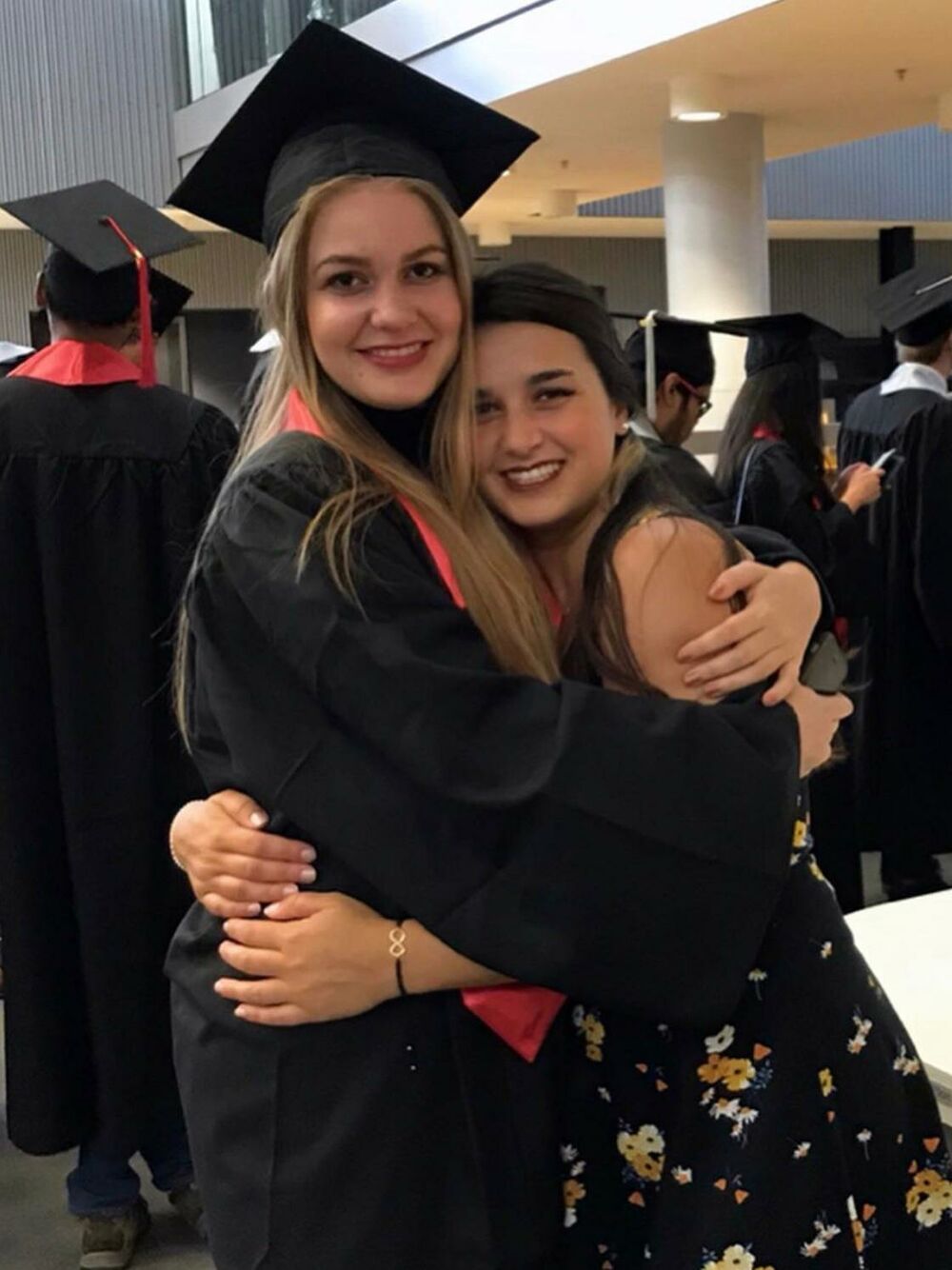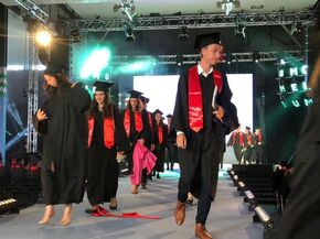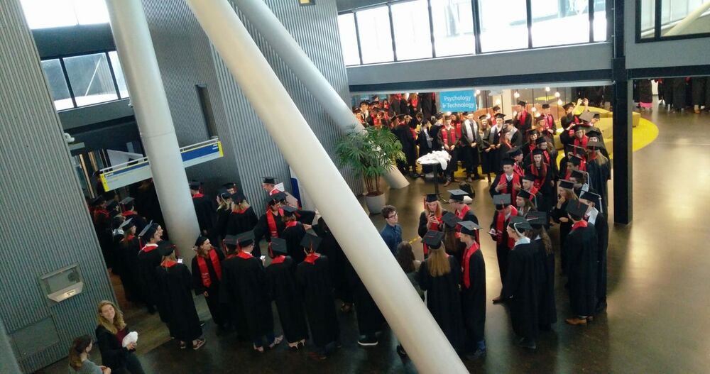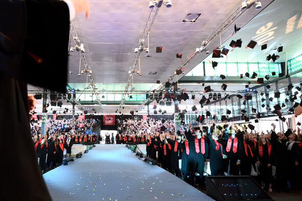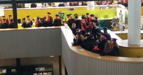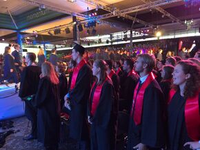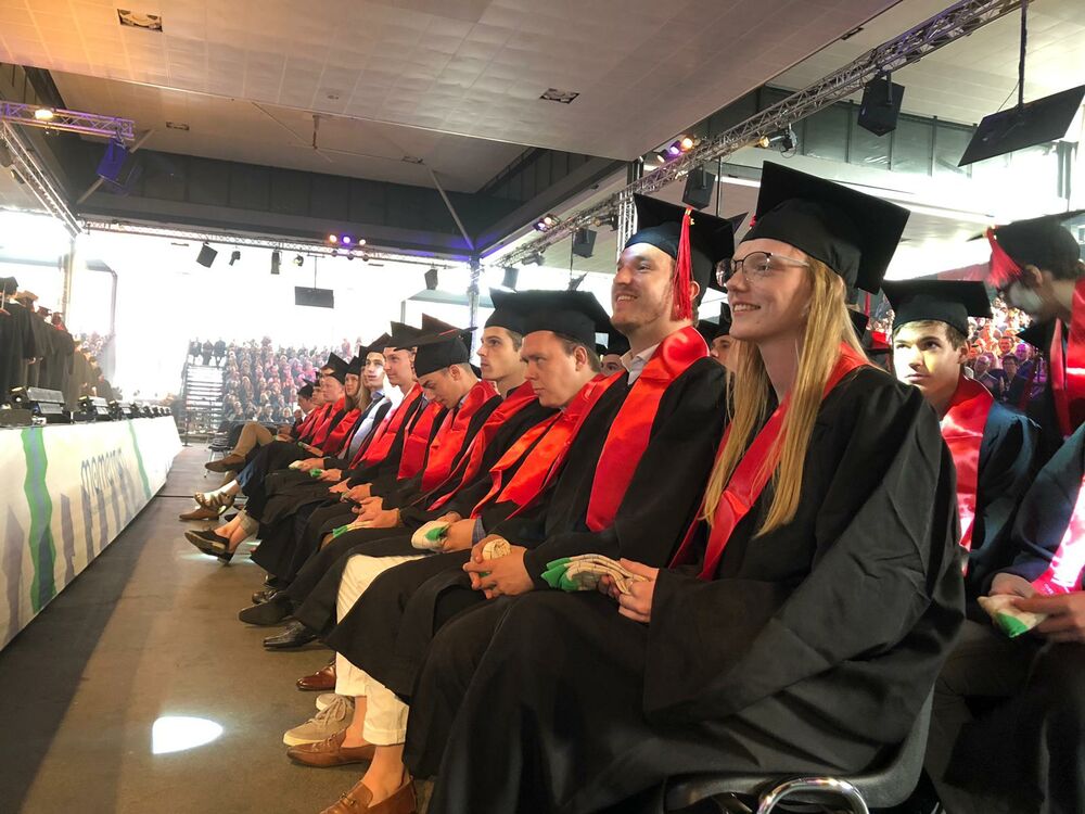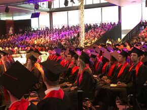 De rector sloot af met een countdown naar "het moment waar jullie allemaal op hebben gewacht. Dus sta op, pak jullie camera's, pak jullie telefoons. Zijn jullie klaar?". En na vijf tellen gingen de honderden zwarte caps van de afstudeerders, vergezeld van confetti, de lucht in.