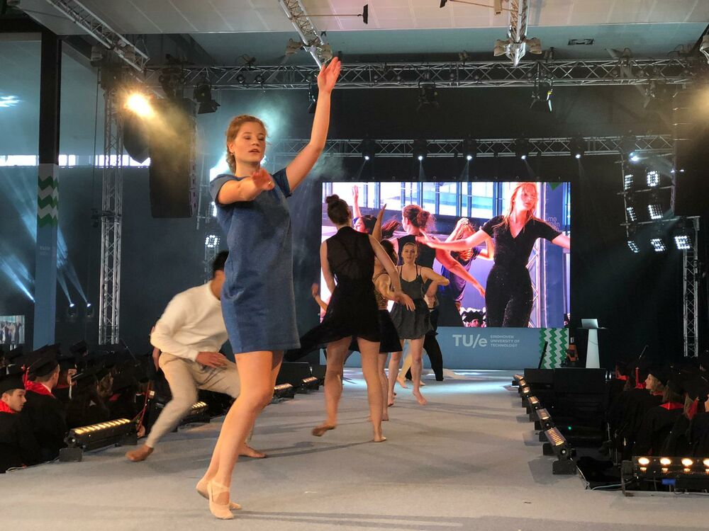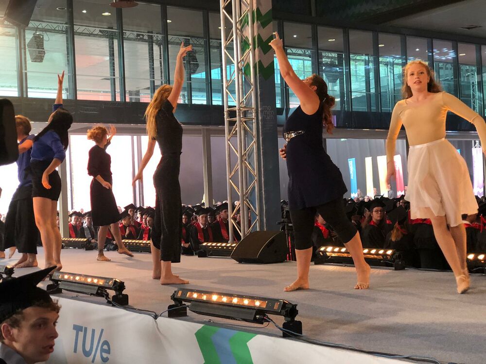 16.38 uur | Na hun twee flashmobs eerder vandaag in het Auditorium, laten de dansers van studentendansvereniging Footloose ook tijdens de MomenTUm-ceremonie in de markthal zien wat ze in huis hebben. De dansers liepen mee aan het eind van de voorgaande Walk of Fame, om daarna hun toga's uit te trekken en het podium te pakken met een moderne choreografie.