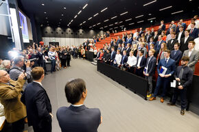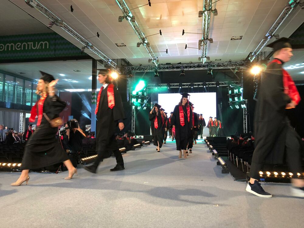 16.10 uur | De MomenTUm Ceremony is begonnen met de binnenkomst van het traditionele cortège, vergezeld door een fanfare. Zometeen, zodra alle hoogleraren en bestuurders hun plek in de hal hebben gevonden, begint de Walk of Fame, waarvoor een kleine dertienhonderd afstudeerders (gegroepeerd per opleiding) zullen passeren over de catwalk.