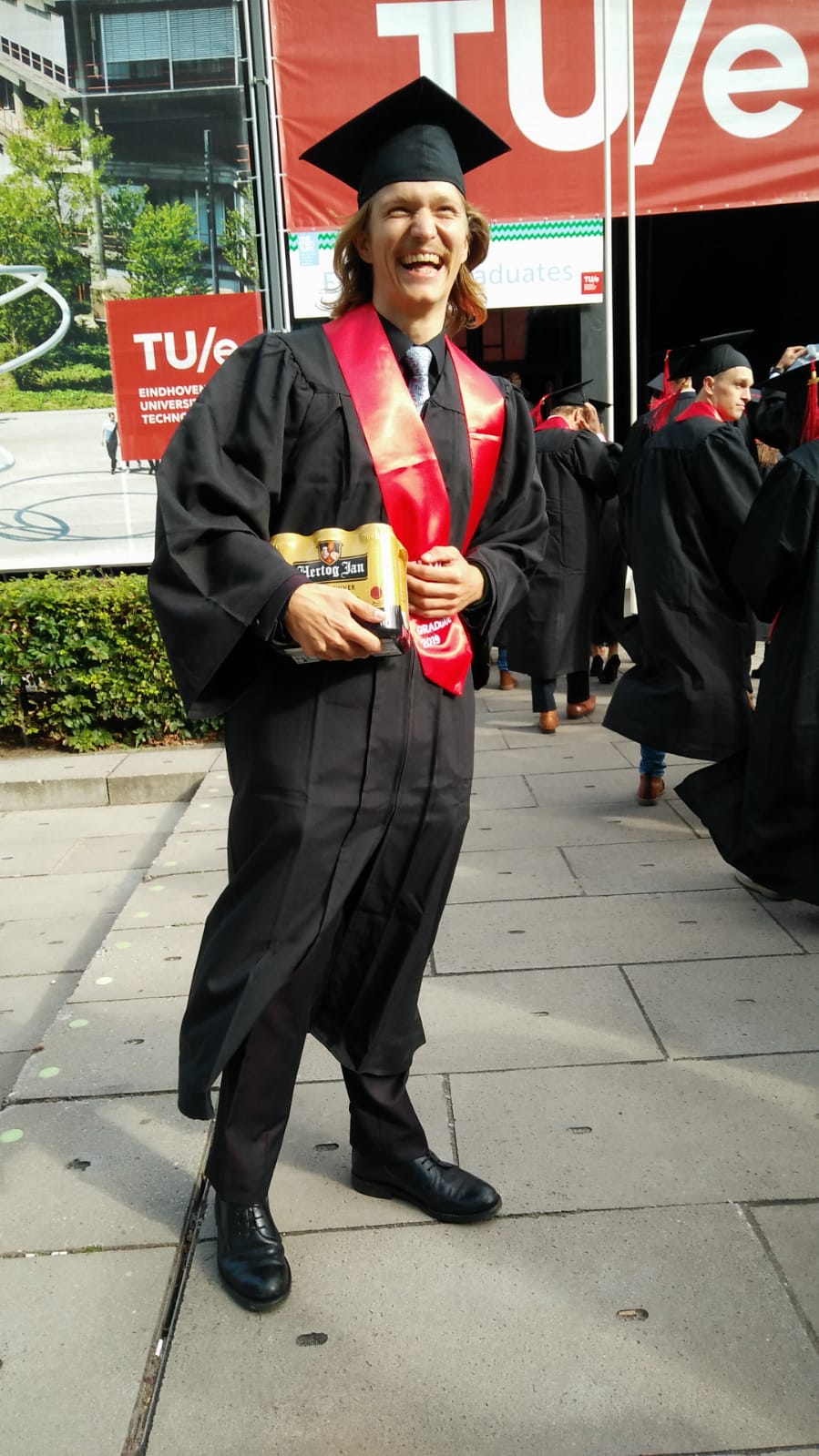 15.46 uur | Wie deze vrolijkerd is, wat hij heeft gestudeerd, wat zijn toekomstplannen en dromen zijn, waar hij naartoe denkt te gaan met dat glimmende sixpack Hertog Jan, en of hij van plan is om te delen - wij weten het allemaal niet. Gelukkig zijn wij niet van de campuspolitie en wensen we hem vooral een mooie ceremonie, gevolgd door een memorabel feest vanavond. Gefeliciteerd met je diploma!