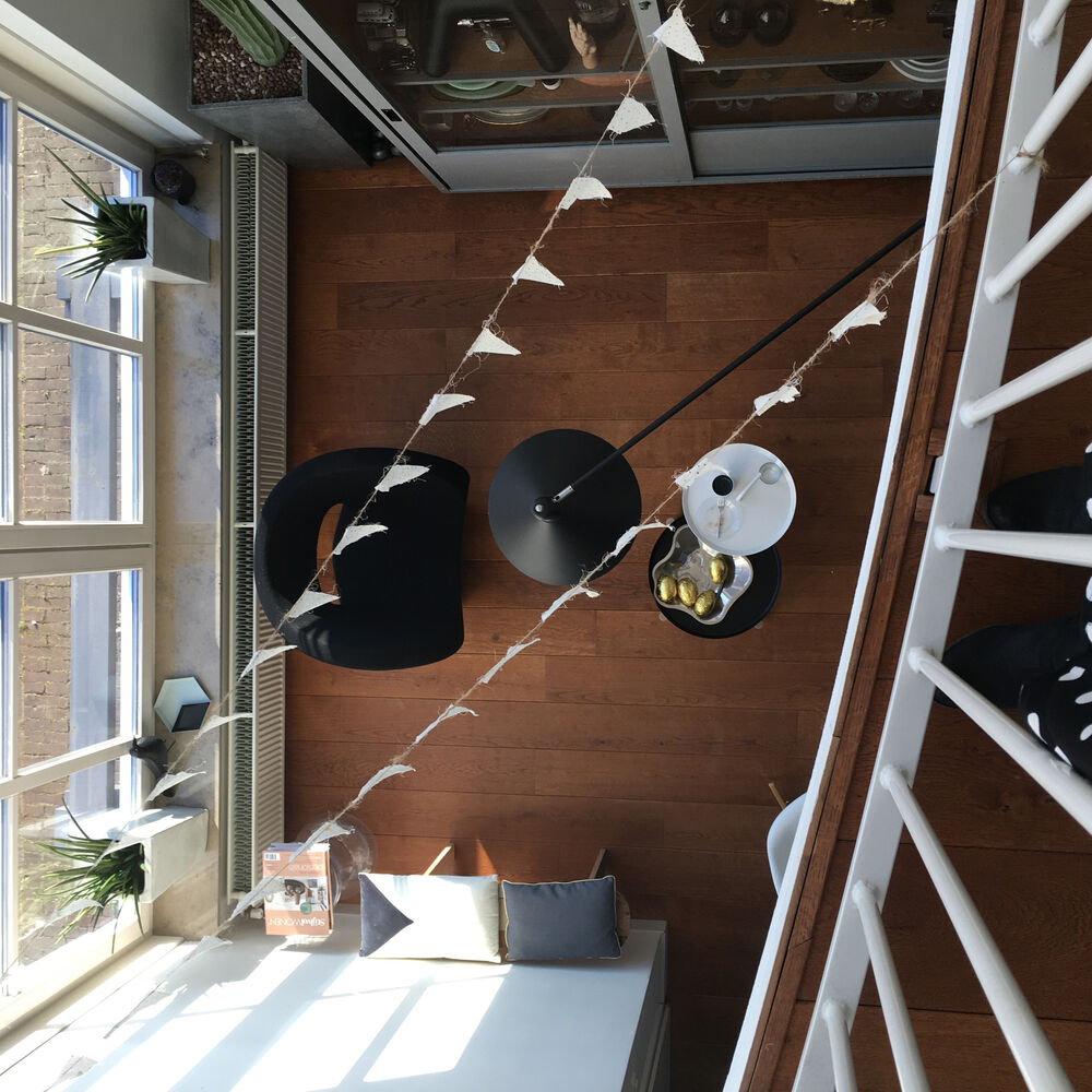 Het huis telt vier verdiepingen. “Erg fijn in deze tijd, want ik woon hier met man en twee tienerdochters en nu we allemaal thuis zijn, hebben we ieder een eigen etage. Mijn man zit beneden aan de keukentafel bijna fulltime online te vergaderen. Mijn oudste dochter van 17, die nu opeens al geslaagd is voor haar vwo, zit op haar slaapkamer op de tweede verdieping projecten voor school af te ronden en de jongste van 15 heeft de volledige zolderetage. De meisjes zijn gelukkig redelijk zelfstandig.” Ze vindt deze constructie "best gezellig", want de begane grond en eerste verdieping zijn met elkaar verbonden door een vide, “dus je hoort elkaar wel, maar zit elkaar niet in de weg”.