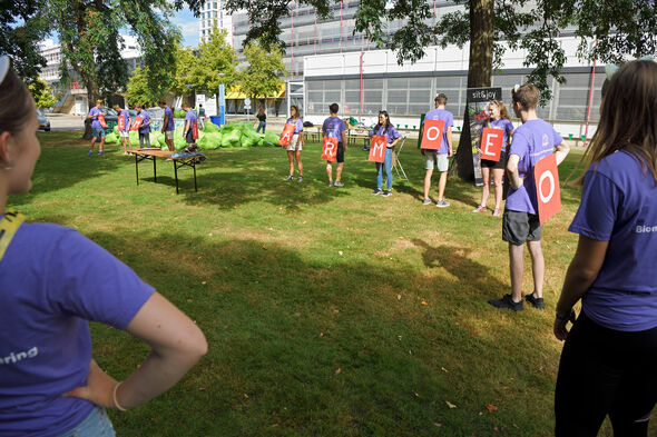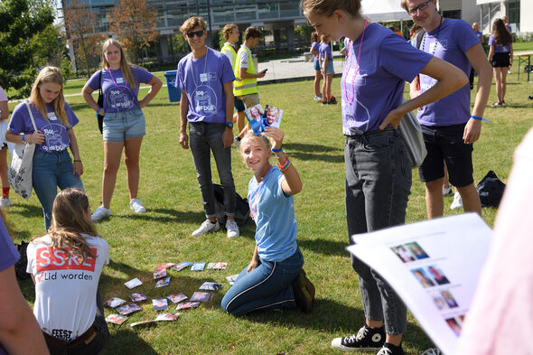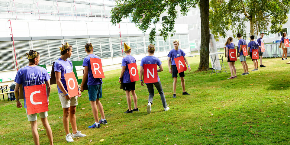 Je zal er maar staan; een letter op je buik en een letter op je rug. Op anderhalve meter afstand van je groepsgenoten die ook gesandwicht zijn met letters. En dan krijg je vragen waarvan je het antwoord moet bedenken én vormen met je voor- of achterkant. De tijdsdruk is enorm, want een eindje verderop staat nog zo’n groep die ook deze opdracht – bedacht door studievereniging Protagoras- doet. Maar dan misschien wel sneller.