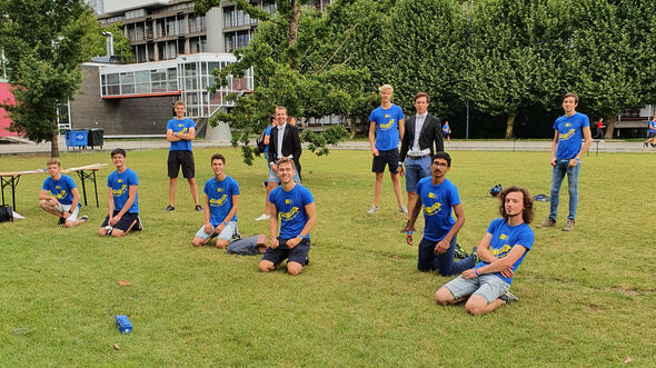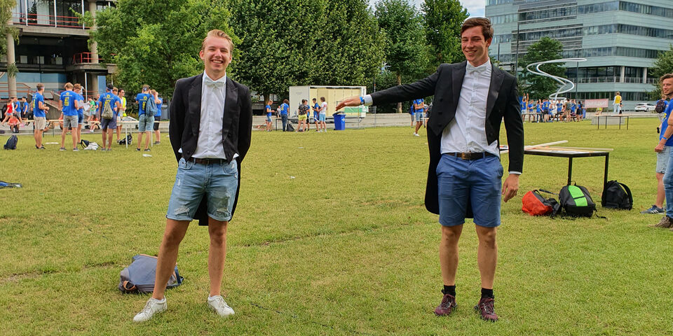 Toen dinsdag de kids doorkregen dat veel introbuddies wél matchende pakjes dragen, werd dat ook hun wens. “Een weddenschap werd bedacht; als de kids 15 challenges van studievereniging Simon Stevin uitvoeren, dan doen wij iets leuks aan”, zegt Koen (rechts op de foto). “Maar het enige dat wij in de kast hebben hangen dat hetzelfde is, is ons rokkostuum van het Eindhovens Studenten Corps.”