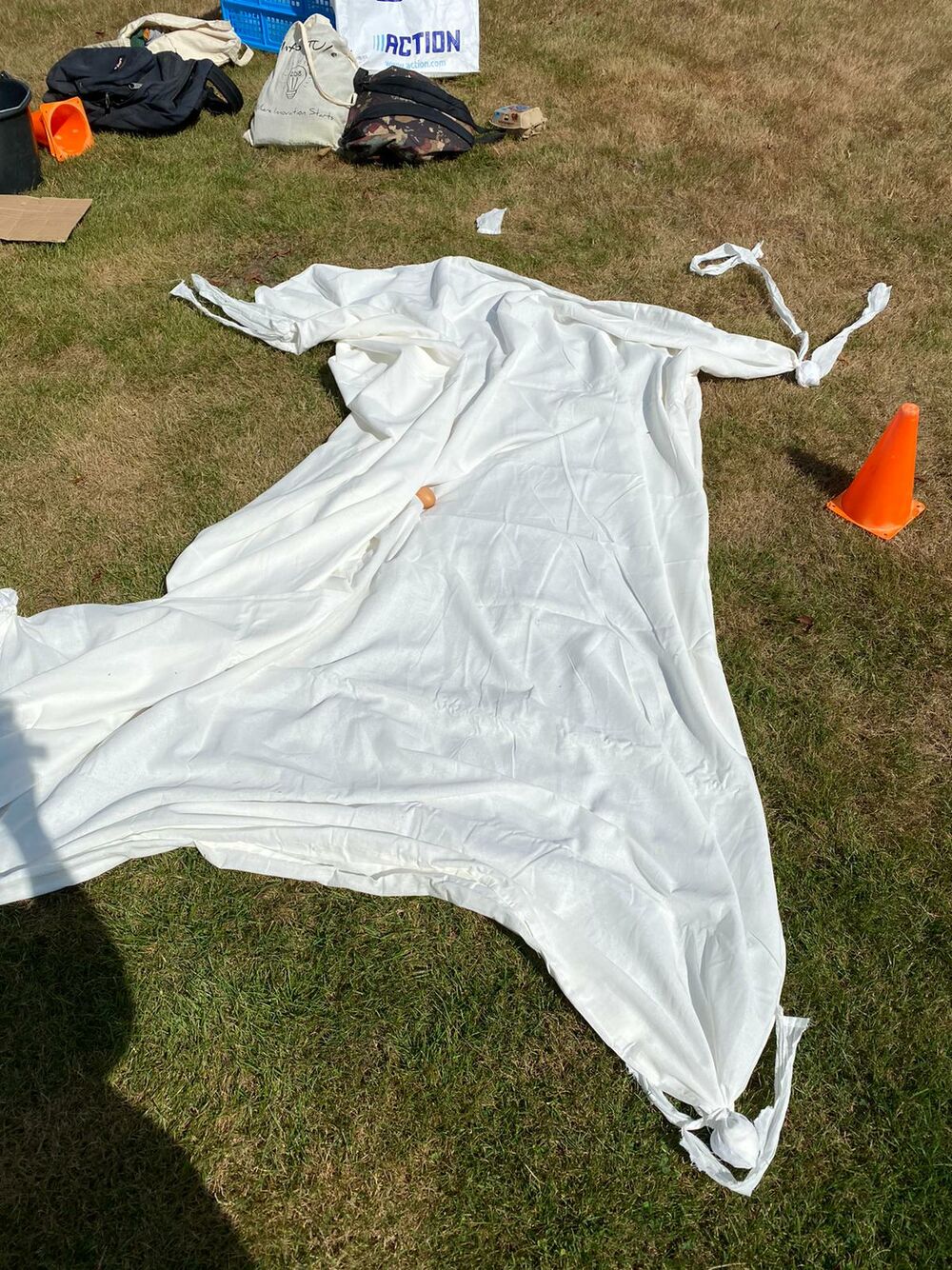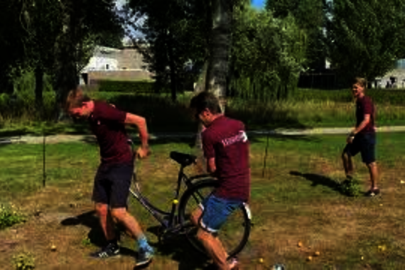 Aan de rand van het veld treffen we Fysisch Dispuut Hawking van studievereniging J. D. van der Waals met een fiets met één wiel, een bak pingpongballen en een aantal grotere ballen. Dat maakt nieuwsgierig. Wat moet dit voorstellen? Niels Peters van het dispuut vertelt graag even een stukje geschiedenis: “De oprichters werden eens gevraagd op een tent te letten op het Koeveld. Die dachten: ‘ja dat kan wel, maar dan hebben we wel hapjes en drankjes nodig. Dus ging een lid op de fiets naar huis om hapjes, drankjes en een volle frituurpan op te halen. Dat ging lang goed, maar helaas niet tot het eind en hij viel met die pan. Nu halen we die herinnering op. De fiets is nog net goed genoeg hiervoor, de bak pingpongballen is de friteuse en de andere ballen zijn voor de tegenstanders om te gooien om het moeilijk te maken. Eerder deden we dat met water, maar dat mocht vanwege corona helaas niet. Maar dit werkt ook." En dat wordt natuurlijk even gedemonstreerd: