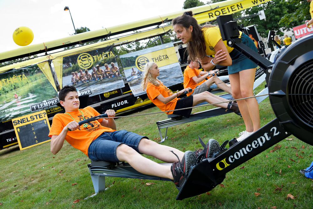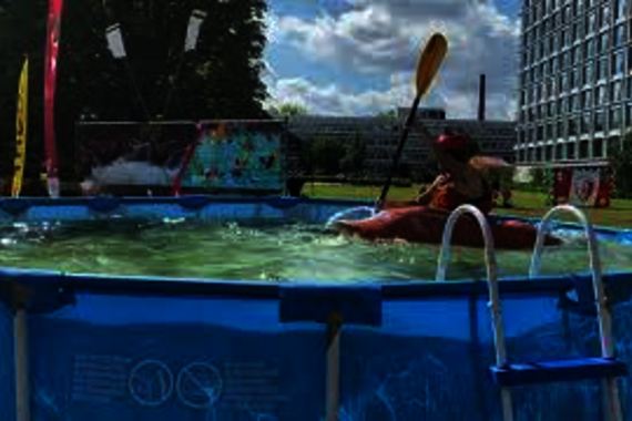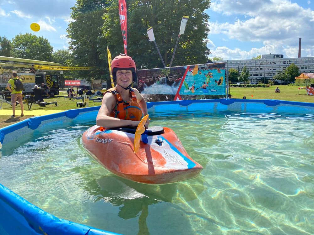 Kanovereniging Okawa heeft een eigen zwembad op het veld geplaatst om zo de introkids te imponeren met vette trucs op gebied van wildwater freestyle. “Met deze kano kan je in principe alles wat je met een skateboard ook kan”, zegt Ron de Crom van Okawa. “Een salto, schroef, radslagen.” Vanwege corona mogen de introkids zelf helaas het badje niet in, maar niet getreurd: donderdag en vrijdag zijn er kanoworkshops op de Dommel. Tijdens de campusmarkt demonstreert De Crom in ieder geval al wat trucjes die de kids ook kunnen leren bij de vereniging. De workshops op de Dommel gaan langs wat vistrapjes en stroomversnellingen. Veel mensen denken dat ze dat allemaal wel kunnen omdat ze op vakantie wel eens ooit gekanood hebben, maar in praktijk blijkt het vaak toch uitdagender dan verwacht.”