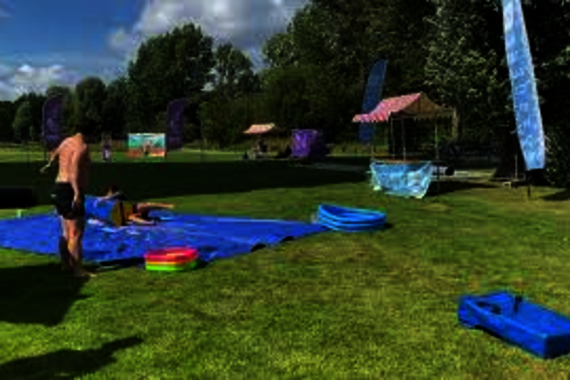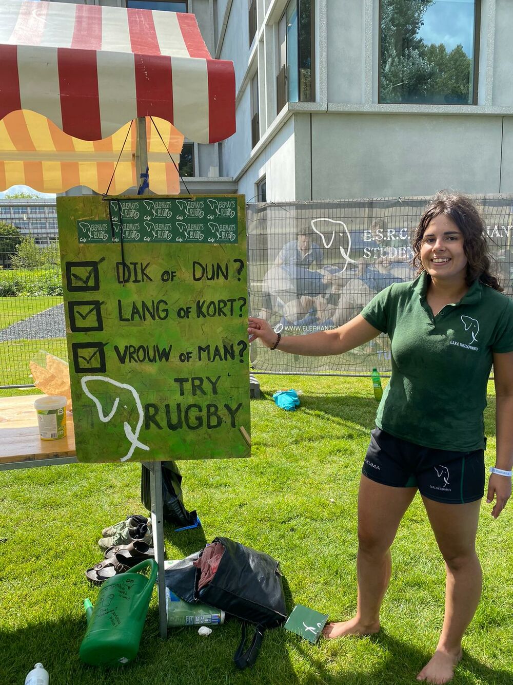 Mocht er behoefte zijn aan verkoeling dan kun je doorschuiven (pun intended) naar de zeeptacklebaan van The Elephants. De rugbyvereniging staat op de campusmarkt met een duidelijke boodschap: rugby is niet enkel voor brede grote kerels. Louise de Laat laat trots het bord zien dat dat nog eens moet benadrukken, evenals een demonstratie op de vloer: