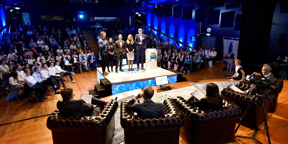 De foto is gemaakt door Bart van Overbeeke tijdens de TU/e Contest van 2019, een wedstrijd waarbij deelnemers hun beste ideeën pitchen.