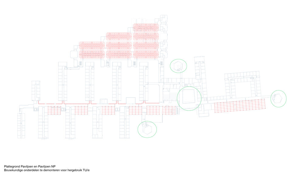Er zijn wat zaken die de TU/e zélf wil hergebruiken, zoals de stalen spanten van Paviljoen NP, de betonnen kolommen, een luchtbehandelingskast, enkele betonnen kozijnen, de afzuigkap van de keuken van het Paviljoen en wat deurhendels. De kolommen, spanten en kozijnen worden opgeslagen op de campus en zullen later hergebruikt worden.