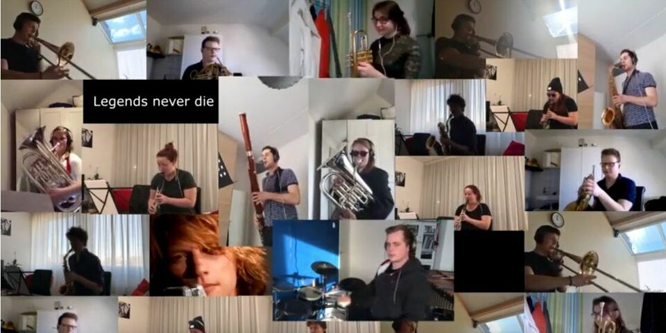 De Fontys-student Bedrijfskunde speelde meteen zelf drie hoornpartijen in en deelde de clicktrack met de groep. Iedereen ging aan de slag, speelde meerdere partijen in en stuurde het videoresultaat daarvan naar Van Noort, die het tot een geheel smeedde. “Mijn computer had het er maar zwaar mee om 21 instrumenten samen te voegen tot een geheel”, zegt de hoornist.