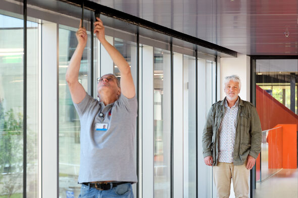 Dienst Huisvesting heeft in deze tijd elke werkdag een vast koppel van Beheer en Onderhoud in touw op de campus, voor calamiteiten en als aanspreekpunt voor de vele externe partijen die er volop aan het werk zijn. Thijs en Ad zijn het vaste duo op donderdagen. Al jaren zijn ze collega’s en ze kennen elkaar dan ook goed. De kwinkslagen en grapjes zijn dan ook niet van de lucht tijdens het interview via Skype en ze vullen elkaar aan waar nodig. “Ik ben een beetje losbandig en hij corrigeert me af en toe”, grapt Ad.