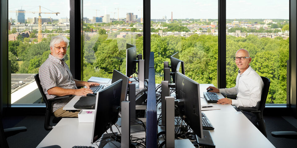 Op afstand werken, dat is verre van Ad van Rooij’s ding. De vastgoedbeheerder en contractregisseur bij Beheer en Onderhoud (Dienst Huisvesting) is een sociaal dier en heeft graag mensen om zich heen. Maar inmiddels heeft hij een modus gevonden in het thuiswerken. En mag hij elke donderdag naar de campus met zijn ‘duo-partner’ Thijs Mooren, accountmanager bij Beheer en Onderhoud.