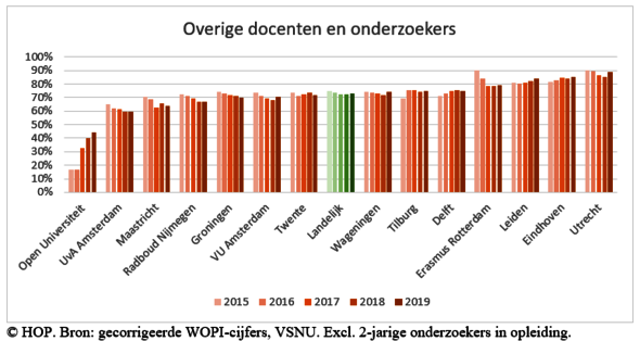 Alles bij elkaar heeft 59 procent van al het personeel aan de universiteiten een tijdelijke aanstelling. Zonder de promovendi en ondersteunende diensten gaat het om 39 procent. Daar komt niet of nauwelijks verandering in.