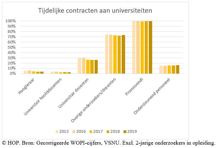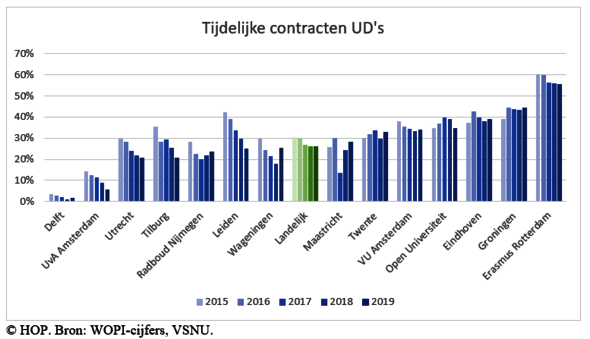 Een kwart van alle universitair docenten (UD’s) zit tijdelijk op zijn of haar post. Hetzelfde geldt voor driekwart van de ‘overige’ docenten en onderzoekers. Promovendi hebben sowieso allemaal een tijdelijk contract.