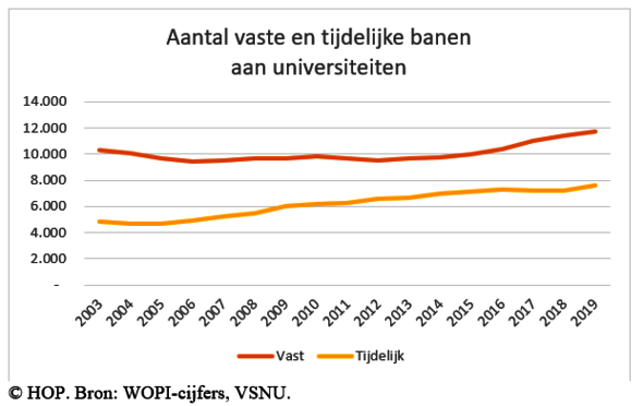 Maar universiteitenvereniging VSNU kijkt er anders tegenaan, laat een woordvoerder weten. Er is immers sprake van een lichte daling van het aandeel tijdelijke contracten, al gaat het “minder snel dan we graag zouden willen”.
