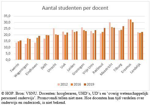 Daar komt aan de universiteiten weinig van terecht. Er zijn wel meer docenten, maar er zijn nóg meer studenten. In 2012 waren er 22 studenten per wo-docent, en dat is nog steeds zo. Achter de komma is het zelfs licht achteruit gegaan.