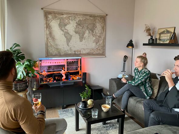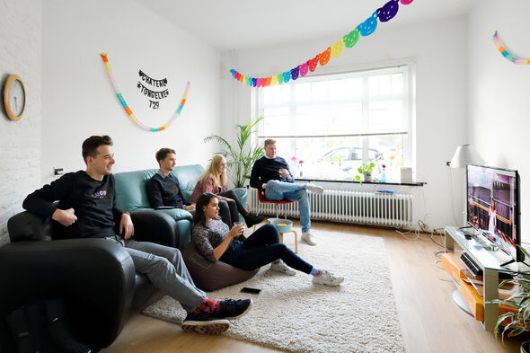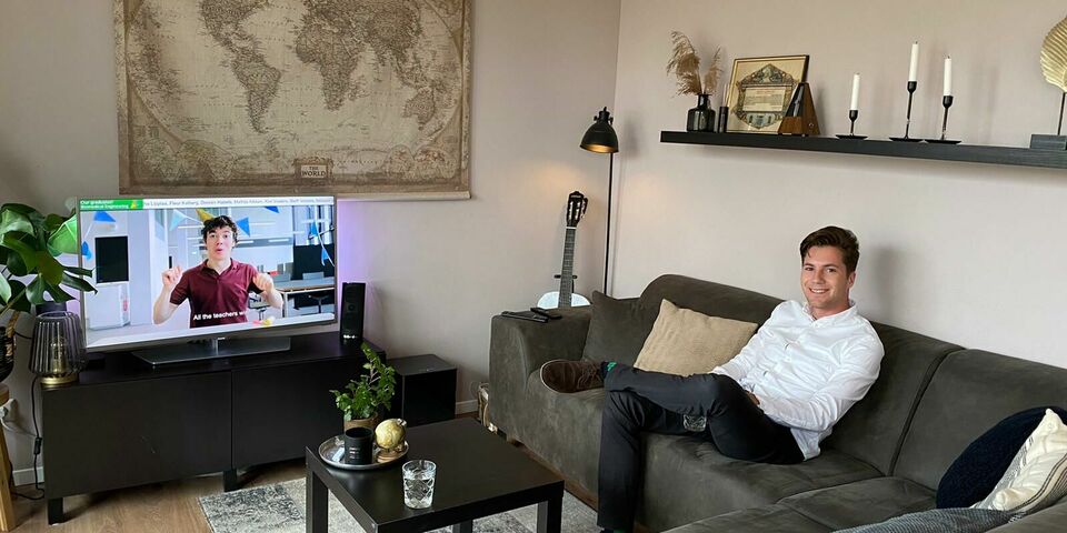 De livestream heeft Dion fraai op de TV gezet met een klassiek schaaltje nootjes op de salontafel. Of er nog mensen thuis kijken die hij kent? “Ik ken wel wat mensen die ook geslaagd zijn, van mijn dispuut en van de opleiding. Maar ik weet niet of die ook allemaal kijken.” Al snel heeft hij een berichtje de groepschat in geholpen. Ping, ping, reacties komen binnen. “Verder kijkt niemand. Tja, misschien hebben ze het niet echt meegekregen? Ik kan me er ook geen mail over herinneren ofzo, maar heb het wel op Facebook en Insta gezien."