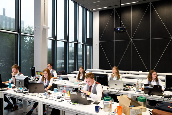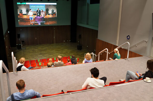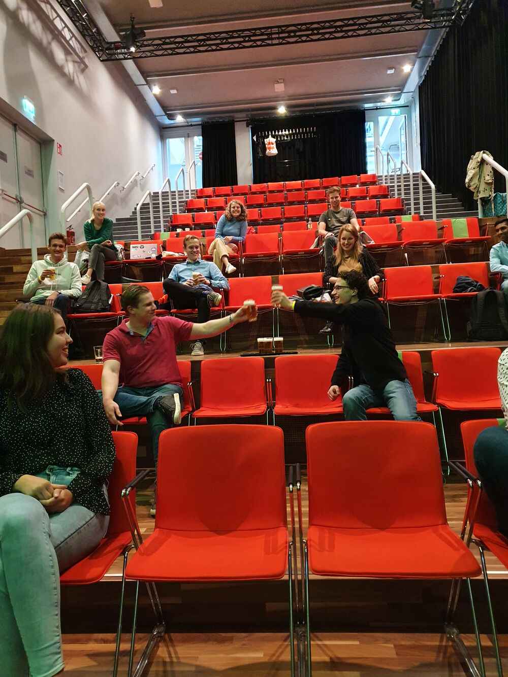Door naar de Coronazaal. Daar zitten een kleine twintig studenten van studievereniging Pattern (Data Science) keurig op afstand van elkaar. Het lukt ze net te proosten met een beker bier. Als ik binnenkom zijn ze aan het overleggen waar ze gaan eten met de groep, want die livestream helemaal afkijken, hoeft van hen niet. “Het was wel heel leuk. Ik heb echt gelachen om de quiz”, zegt Isabel van den Heuvel. “Ik hoopte een mooie TU/e-hoodie te winnen, maar helaas. Ooit gaat er voor mij zo’n trui uit de lucht vallen”, zegt ze en ze heeft gelijk, want als ze haar master Data Science in Engineering afmaakt, krijgt ze er een van de universiteit.