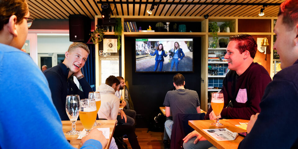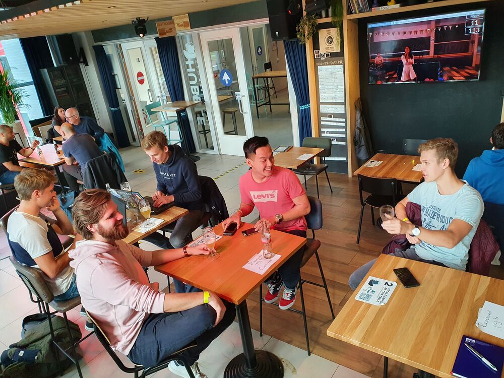 In Hubble vind ik een groep van vijf vrienden die allemaal tegelijk Technische Bedrijfskunde zijn gaan studeren. Drie ervan hebben hun bachelor dit jaar gehaald. Of dit een feestdag voor ze is? “Nou nee, we hebben de hele middag gestudeerd in Atlas en komen nu een vrijdagmiddagborrel doen. En we moesten eerst uitbrakken van de Industriaborrel in café Spijker gisteravond”, zegt Niek de Jong. Tuurlijk is het leuk dat de livestream aan staat, “maar ik zou die niet aanzetten als ik alleen was geweest”, zegt Jun Hao Wu, die er met zijn rug naartoe zit.