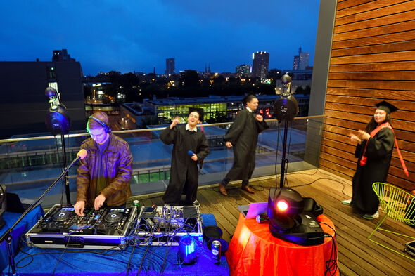 Janssen heeft ondertussen een blad met warme chocolademelk gehaald, maar ik ga naar de after-afterparty van MomenTUm. Thuis, dat wel. Want een online after-afterparty wordt vanaf 19.00 uur verzorgd door Dé Betere Studenten Avond op Twitch. Vanaf een ‘vette locatie’ vermaakt dj Zowizo alle MomenTUm-gangers met muziek, small talk en spelletjes. Het Dakterras, eigenlijk het balkon op de vierde verdieping van MetaForum, is gekozen vanwege het mooie uitzicht op de skyline van Eindhoven. Ingegeven door de intelligente lock down dit voorjaar, is Dé BSA gestart. Sinds april is er iedere donderdagavond een livestream te volgen die gemaakt wordt in de kelder bij DEMOS. “Het blijft leuk”, zegt Mirko Bolsenbroek, een van de harde kern van dj’s en mc’s. “We zijn niet te stoppen. Ook na vanavond gaan we voorlopig iedere donderdag door.”