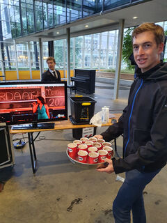 Het grote scherm boven de trappen bij de ingang is zwart. Masterstudent Mechanical Engineering Stijn Janssen vindt dat een gemiste kans. “Simon heeft nog geprobeerd de livestream daarop te laten vertonen, maar kreeg te horen dat er alleen maar foto’s en filmpjes van maximaal dertig seconden op mochten. Daarop hebben ze maar het tv-scherm uit het bestuurshok gehaald.” En daarop was niet alles goed te horen. “De quiz leek gehouden door een komisch duo. Zag er lekker luchtig uit, maar ik heb er niets van verstaan, want eerlijk gezegd hebben we er gewoon doorheen gekletst. Ik denk dat we het meer betrokkenheid had gebracht als het op het grote scherm werd vertoond.” Maar volgens Van de Vijfeijke geeft de livestream ook via een klein scherm toch heus wel sfeer aan de koude borrel.