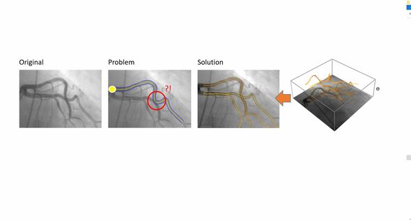 Veel medische afbeeldingen worden met computers beoordeeld. Maar vaak staan er complexe vaatstructuren op de foto, waarbij bloedvaten boven op elkaar lijken te liggen. Denk bijvoorbeeld aan de bloedvaten rondom de oogbol, bij het hart of de zenuwcellen in het brein. Op een 2D-röntgenfoto zijn die vaten vaak lastig van elkaar te onderscheiden. Automatische beeldanalysemethoden plakken dan soms twee verkeerde vaten aan elkaar (zie bijvoorbeeld de middelste foto hieronder). Een cardioloog die met een katheter door een kransslagader navigeert, loopt dan het risico om niet uit te komen op de plaats van bijvoorbeeld de vaatvernauwing.