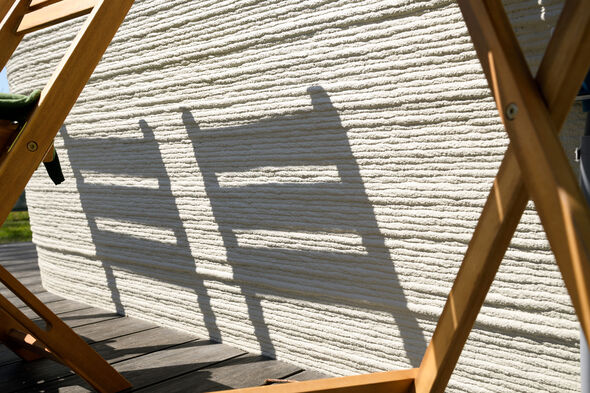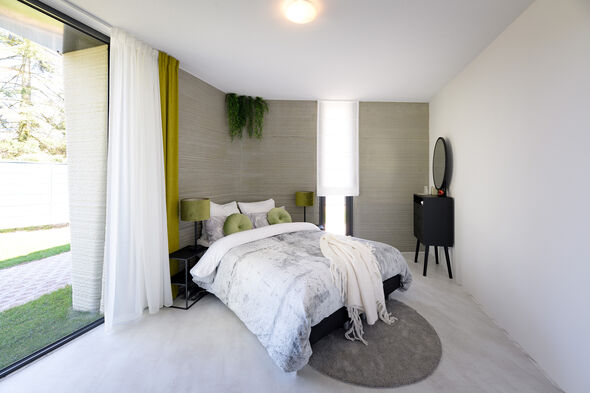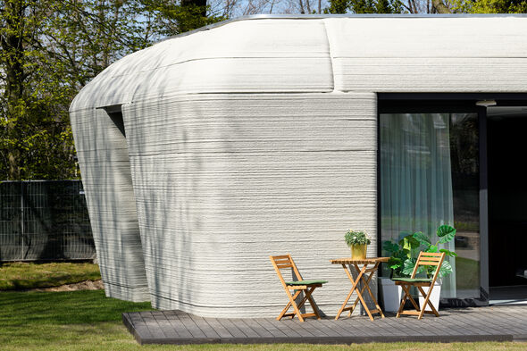 Op een smetteloos gazon staat een bungalow die van beton is gemaakt. Beton dat niet gestort is, maar geprint. Van buiten ziet het huis eruit of het door de familie Flintstone bewoond zou kunnen zijn: de hoeken zijn afgerond, de vormen organisch. Van binnen is het appartement comfortabel en modern ingericht, met als sfeervolle extra de ribbelstructuur van de buitenmuren, die toont hoe deze laagje voor laagje uit de printer zijn komen rollen.