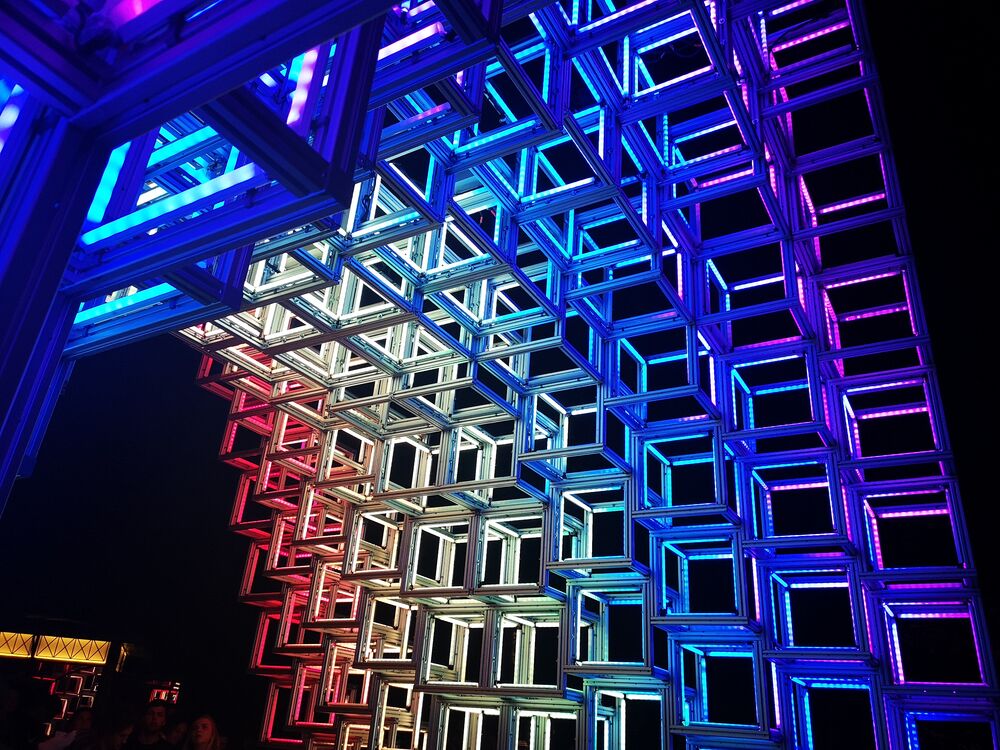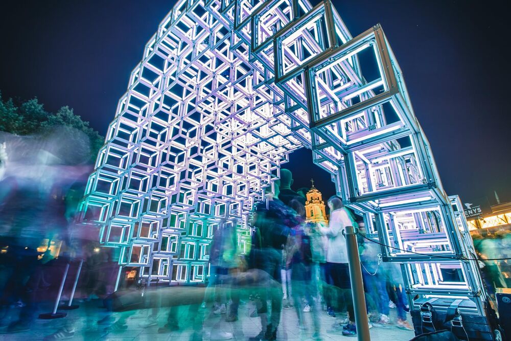 “De laatste keer dat we alle 150 kubussen hebben opgebouwd was tijdens het Eindhovense lichtfestival GLOW in 2019”, vertelt Anne Hopstaken, teamlid van Hypar Collective en masterstudent Industrial Design aan de TU/e. Hypar Collective, dat in 2017 werd opgericht door studenten Bouwkunde en Industrial Design onder de vlag van studententeam IGNITE, heeft de afgelopen tijd alleen op kleinere evenementen kunnen staan. “Door corona en alle maatregelen die daaraan vastzitten, hebben we in twee jaar tijd niet meer de kans gehad om de volledige installatie op een festival op te bouwen. Grotere lichtfestivals zoals in Kopenhagen en Brussel werden op het laatste moment gecanceld door de strenge maatregelen. In Vilnius mochten we voor het eerst weer de hele installatie opbouwen.”