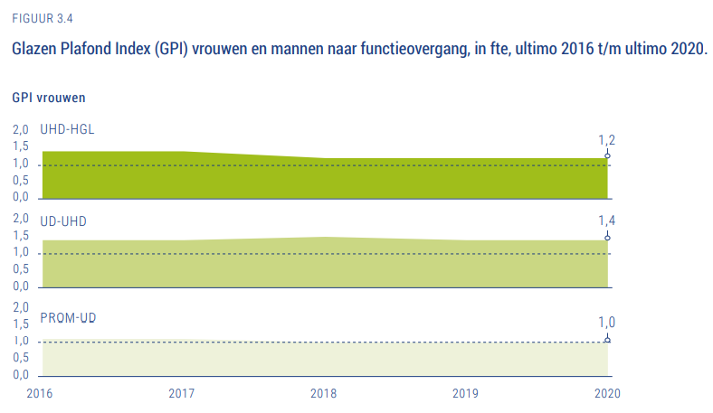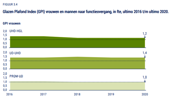 Maar de monitor kijkt ook naar de tussenstappen: krijgen vrouwen evenveel kansen op de carrièreladder als mannen? Daarvoor gebruiken de makers de zogeheten ‘glazenplafondindex’: de verhouding tussen het aandeel vrouwen in twee aangrenzende functiegroepen.