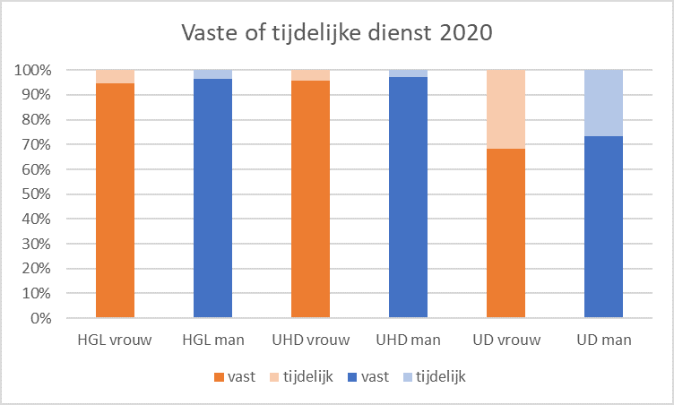 Wel werken vrouwen vaker in tijdelijke dienst, met name als universitair docent: 31,6 procent van de vrouwen tegen 26,8 procent van de mannen heeft een einddatum in het UD-contract.
