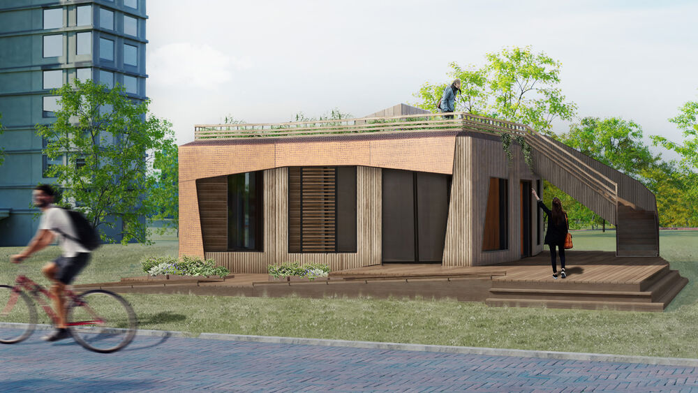 In juni 2022 gaat VIRTUe, net als de andere zeventien deelnemende teams, een groot deel van zijn concept daadwerkelijk bouwen in Wuppertal. Dit demonstratiehuis moet worden neergezet in het volgens Arts uitdagende tijdsbestek van twee weken - dus een keer goed proefdraaien kan geen kwaad. Reden waarom het team zijn bouwwerk komend jaar ook al een keer gaat opbouwen op de TU/e-campus, om het daar te laten zien aan pers en publiek (zie afbeelding hierboven). “We hopen dat we sommige delen in 2022 al samengevoegd kunnen meenemen naar Wuppertal, zodat niet elke schroef er daar weer opnieuw in moet.”