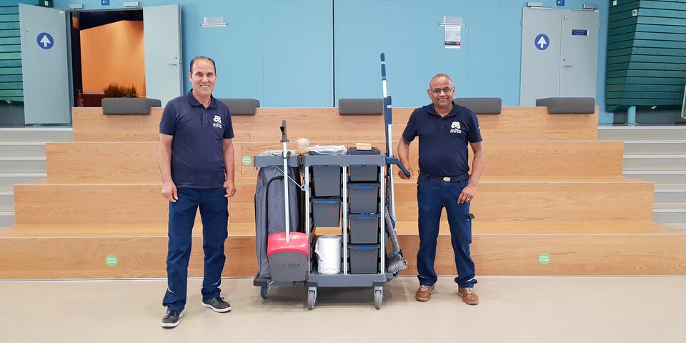 John Jagroe (al 22 jaar werkzaam aan de TU/e) en Moumen Khatiri (8 jaar in dienst) hebben vorig jaar in de maanden april en mei gewerkt in het Jeroen Bosch Ziekenhuis. Jagroe: “Bij Asito hadden we juist de week daarvoor de cursussen Cure en Care gevolgd, die speciaal gericht zijn op schoonmaakwerk binnen ziekenhuizen en verpleeghuizen. De daarmee opgedane kennis konden Moumen en ik direct in praktijk brengen. In het ziekenhuis werden we allebei gekoppeld aan een buddy, die ons liet zien hoe op de corona-afdelingen het werk gedaan moest worden. Vanzelfsprekend werden we helemaal ingepakt in beschermende kleding en voorzien van een mondmasker en een veiligheidsbril.”