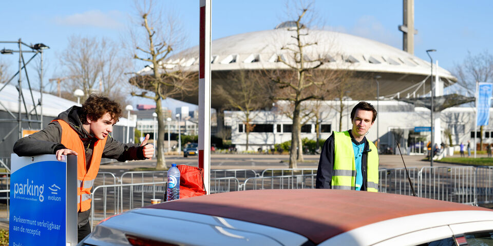 De kwetsbare groepen die deze week hun coronavaccinatie mogen halen bij het Evoluon, worden welkom geheten en eventueel naar de deur begeleid door Demos-leden. De studentengezelligheidsvereniging zet zich in als parkeerwacht. Dat is om maatschappelijke betrokkenheid te tonen, maar ook om geld te verdienen voor de vereniging.