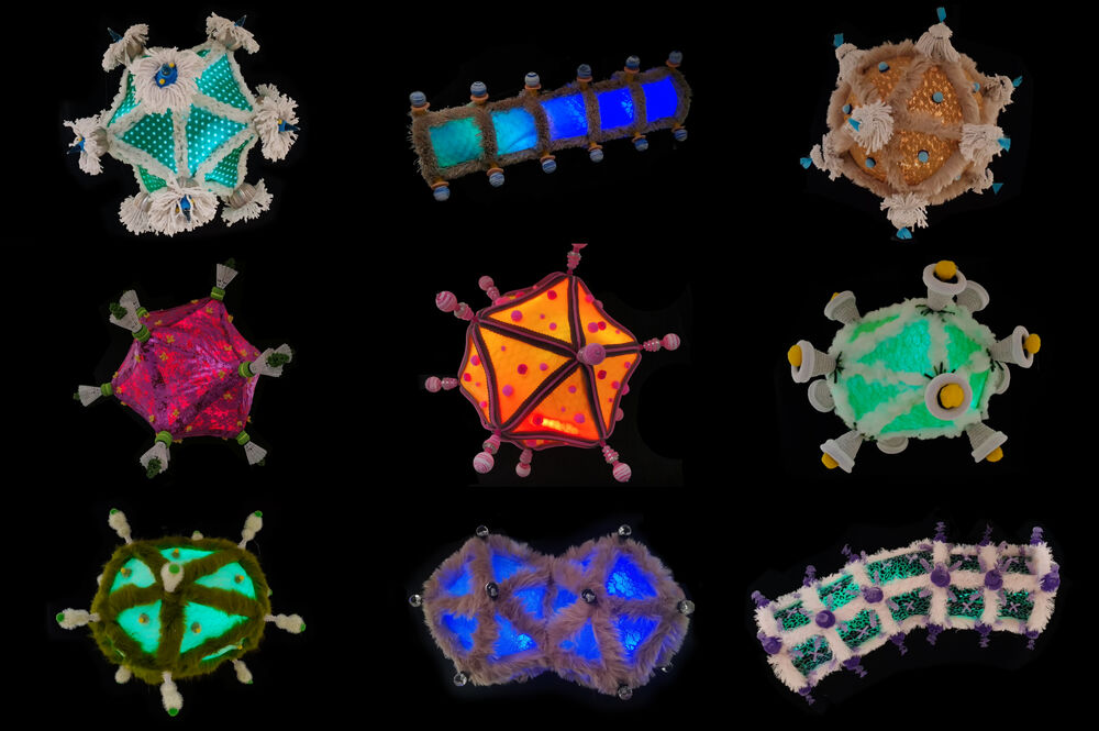 Sterre ten Velde, mede-initiator van dit GLOW-project Nieuwe mutanten en bestuurslid van SSRE, legt uit waarom: “We wilden als studenten een positieve draai geven aan al het negatieve coronanieuws. Het virus is een lelijk fenomeen, maar als je er microbiologisch op inzoomt, zie je erg mooie en bijzondere vormen. Die hebben we weergegeven met alledaagse prullen zoals wc-borstels, badmintonshuttles en dweilen, in combinatie met prachtige stoffen. We hebben een metalen constructie gebouwd voor het geheel en al met al was het een heel leuk project.”