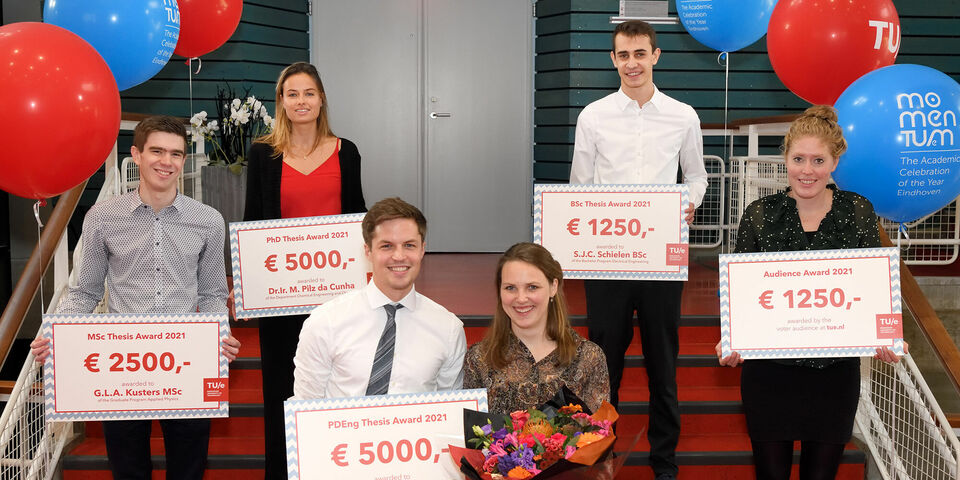 Voorafgaand aan de eerste sessie van MomenTUm werden deze middag de TU/e Academic Awards voor de beste scripties van bachelor-, master-, PDEng- en PhD-studenten uitgereikt. Ontwerper-in-opleiding Floor van Schie won de Audience Award voor haar bijdrage aan een energietoren voor festivals. De Marina van Damme-beurs ging naar alumna Kjille Hoeben, directeur van myTemp, een bedrijfje dat een inslikbare capsule op de markt wil brengen die de kerntemperatuur van het lichaam meet.