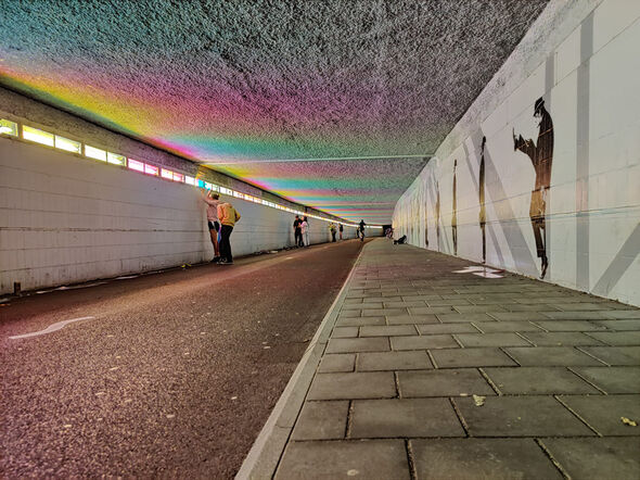 De Jong had van tevoren ook nagedacht over dat andere kunstwerk in de tunnel: muurschilderingen geïnspireerd op de Monty Python-sketch ‘The Ministry of Silly Walks’. “Maar mijn conclusie was dat de twee elkaar niet zouden bijten, ook omdat de schilderingen op de ene muur zitten, en de lampen op de andere.”