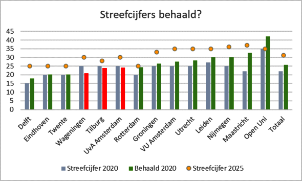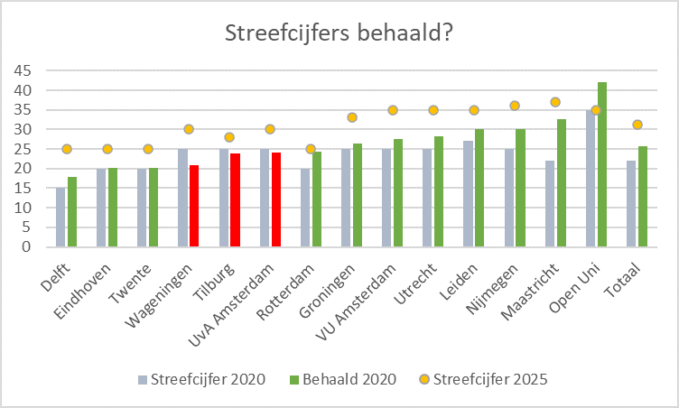 Vijf jaar geleden hebben universiteiten streefcijfers voor het jaar 2020 gekozen. De meeste hebben hun eigen streefcijfer overtroffen. Alleen Wageningen, Tilburg en de Universiteit van Amsterdam zijn daar niet in geslaagd.