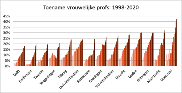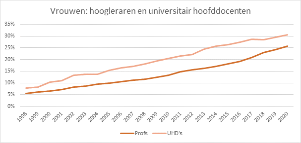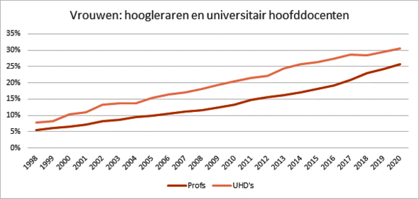 Het is een lange weg, maar hij gaat wel gestaag omhoog. In 1998 was maar zes procent van alle hoogleraren vrouw, inmiddels is dat 26 procent: ongeveer vier keer zoveel. Ook onder universitair hoofddocenten is het aandeel vrouwen verviervoudigd (naar 31 procent).