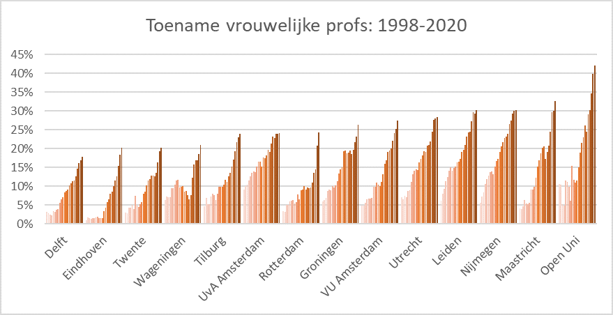 Overigens is afgelopen jaar bij alle universiteiten het aandeel vrouwelijke professoren toegenomen, al moet je in Nijmegen achter de komma kijken om dat te zien: daar was de toename van 2019 naar 2020 slechts 0,05 procentpunt.
