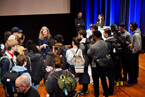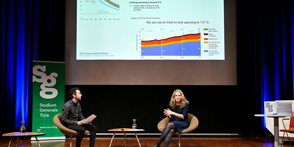 Ruim 150 mensen in de Blauwe Zaal en enkele tientallen online wisten woensdag 6 april het interview met hoogleraar Heleen de Coninck over het IPCC-rapport te waarderen. De hoogleraar Socio-technical innovation en climate change kreeg zoveel vragen dat ze na de lezing nog verder sprak met een groep studenten en medewerkers.