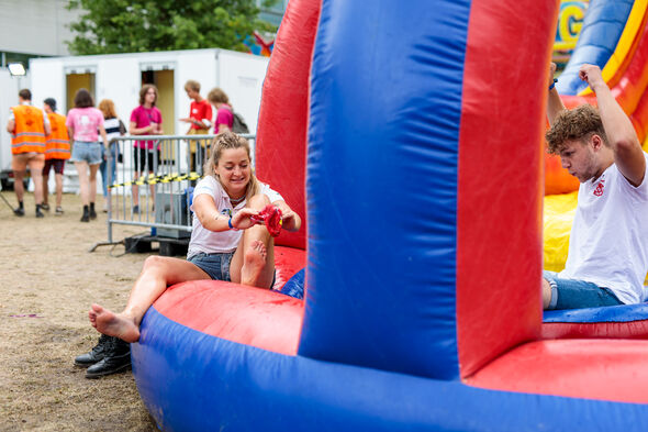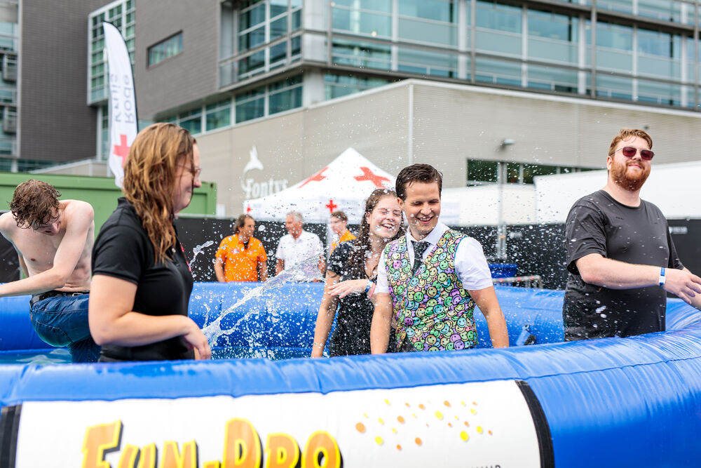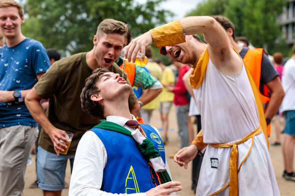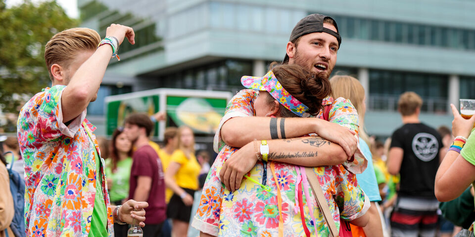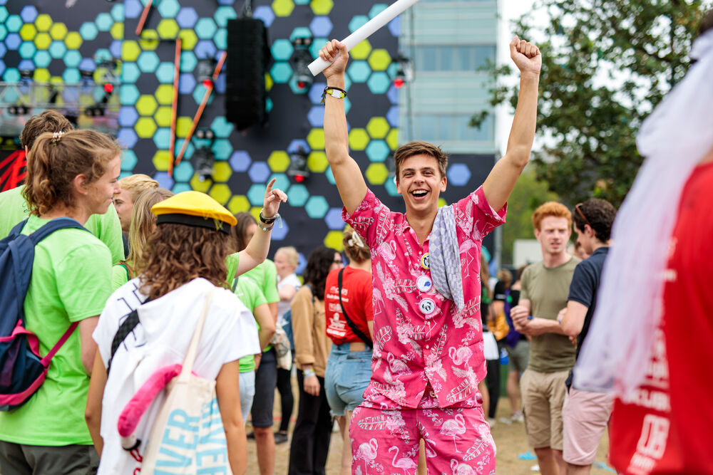 Alle botsauto’s zijn bezet en een studente maakt van haar landing in de waterbak onderaan de opblaas-stormbaan gebruik om haar stoffige korte broek wat op te frissen. Het is één uur ’s middags en de zon heeft zich verscholen achter een grijs wolkendek, maar de koelte die dat met zich meebrengt, is welkom na een tropische Intro-week. Een kater is iets beter te hanteren zonder koperen ploert aan de hemel.