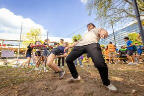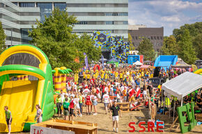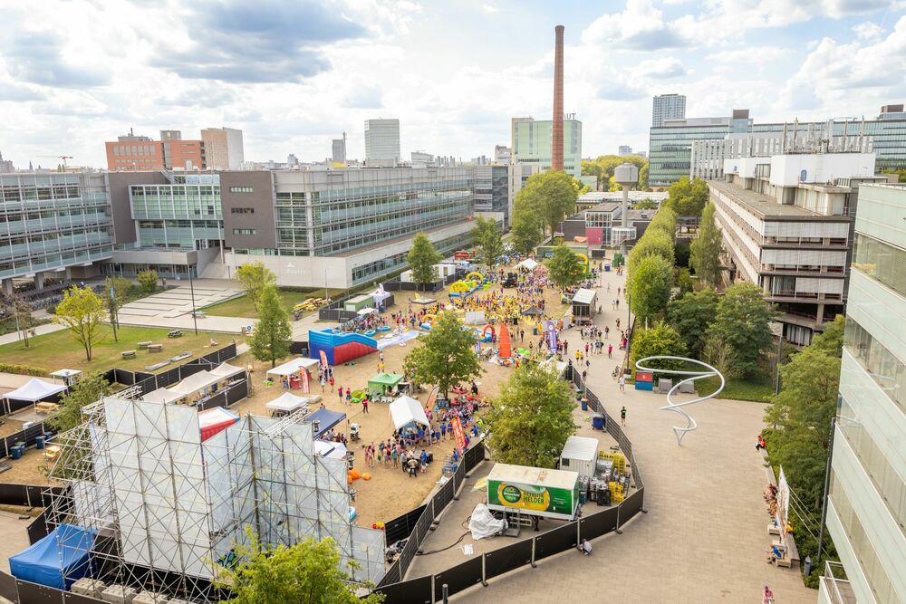 Wie gevoelig is voor prikkels, kan het TU/e-terrein op Intro-dinsdag maar beter mijden. Het is Campusmarkt, en dat betekent dat álle studentenverenigingen, sportclubs, culturele gezelschappen, levensbeschouwelijke groeperingen, studententeams, belangenorganisaties en studieverenigingen die de universiteit rijk is – plus nog wat externen – zich presenteren aan de nieuwe eerstejaars. En dat komt neer op héél veel spelletjes, herrie, water, stormbanen, verkleedpartijen, ballonnen, uitdelertjes, promopraatjes, demonstraties en optredens.