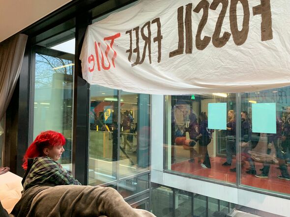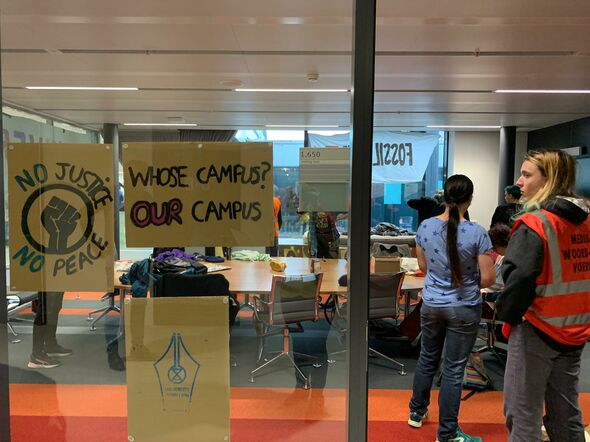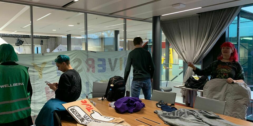 Elf demonstranten hebben zich verzameld in Atlas en hebben daarbij spandoeken opgehangen. Ze willen blijven tot het bestuur de eisen inwilligt. Dat bestuur moet de bezetting zeker hebben opgemerkt, aangezien ze zich bevinden in de kamer aan de overkant.