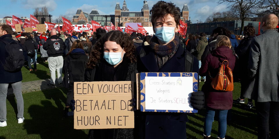 De leuzen schallen over het zonnige Museumplein. Terwijl de Landelijke Studentenvakbond en FNV Young & United de stemming erin brengen, wordt de menigte voor het podium steeds groter. De ene na de andere spreker zweept de demonstranten op.