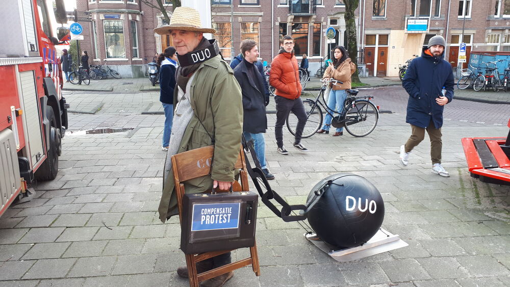 Iets na tweeën verlaten de duizenden betogers het Museumplein voor een protestmars door de binnenstad. In de achterhoede loopt Frans Vaessen met een zware studieschuld aan zijn nek. Hij is uit Limburg naar Amsterdam gereisd, uit solidariteit met zijn studerende dochter en al die anderen die geen basisbeurs krijgen en een hoge schuld opbouwen. “Hun studieschuld kun je echt niet vergelijken met die van mijn generatie.”