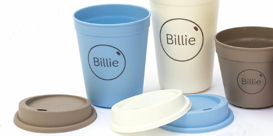 Billie is een stevige kunststof statiegeldbeker, in twee kleuren en maten: een grote lichtblauwe voor thee, cappuccino en latte, en een kleinere bruine voor espresso en koffie. Je koopt er eentje voor een euro, en die kun je vervolgens bij elke horecalocatie keer op keer omwisselen voor een schone.