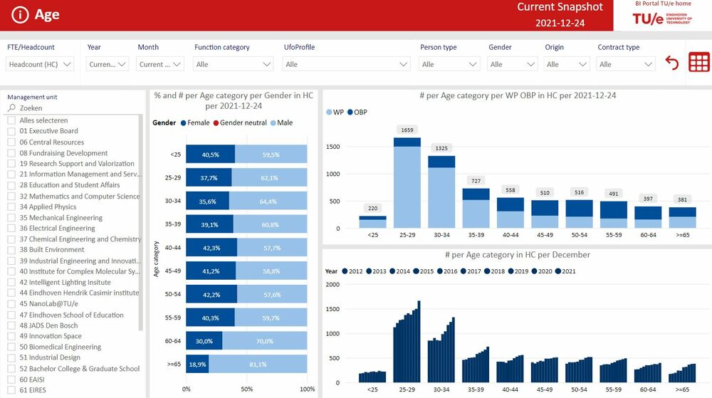 Gegevens die je in de BI-portal kunt vinden, betreffen bijvoorbeeld het aantal studenten (over de jaren heen), leeftijdsverdeling van de medewerkers, de student-staf ratio en het verwachte aantal studenten in het komende collegejaar. Als je je afvraagt hoe de studentengroei zich de afgelopen jaren heeft voltrokken, of hoeveel vrouwelijke hoogleraren we hebben, kun je dat daar nu direct opzoeken.